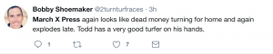 Once again breaking slowly from the gate, March X Press sat in stalking position from the rear of the field. Turning for home, she bulled her way through a small opening and displayed an incredible turn of foot and hind strength to bound to a ½ length victory. TDN Article here.