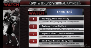 Mind Your Biscuits was last out 3rd in the Breeders’ Cup Sprint at Del Mar and is looking to regain his form he displayed in the early part of 2017. Experts and media agree – Mike Watchmaker noted “Improved a bit in the BC, cycling back to his best.” With the recent retirement of Drefong, Mind Your Biscuits now sits 3rd and Watchmaker Watch: Weekly Divisional Rankings for Sprinters and will look to take another step up the ladder on Saturday.