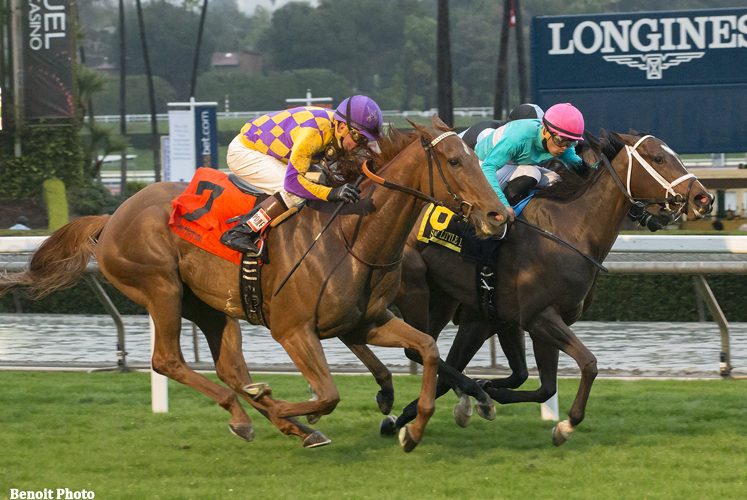 Decked Out and jockey Kent Desormeaux, left, overpower Sassy Little Lila (Luis Saez), right, to win the Grade I, $300,000 American Oaks, Saturday, December 31, 2016 at Santa Anita Park, Arcadia CA.© BENOIT PHOTO