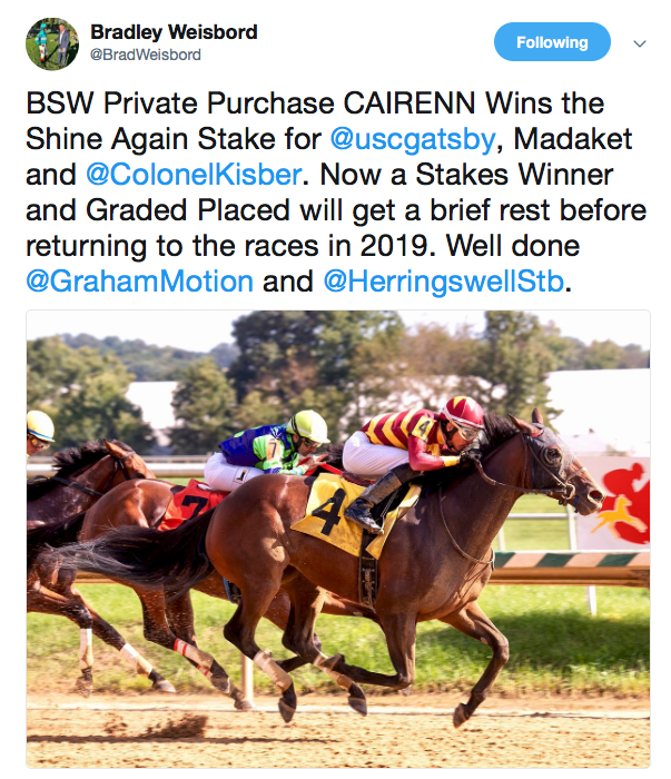 Another highpoint in the weekend came with recent BSW Private Purchase CAIRENN who won the Shine Again Stakes at Laurel Park. Purchased privately on behalf of BSW clients Scott Heider, Michael Kisber and Sol Kumin’s Madaket Stables, Cairenn hit the board in her first three starts for the new partnership before getting her first Stakes win here.