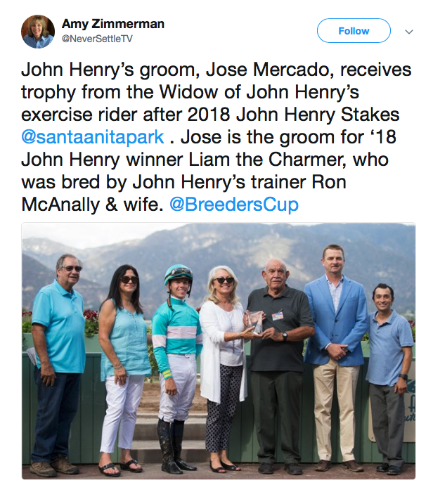 Trainer Mike McCarthy finished a great weekend for BSW client Sol Kumin on Sunday at Santa Anita when his charge, LIAM THE CHARMER, won the G2 John Henry Turf Classic! Liam the Charmer was a $100,000 purchase by Brad Weisbord at the 2017 Keeneland November Sale. Liam the Charmer is now 2-for-2 for Madaket Stables thanks to a wonderful training job by Mike McCarthy who has this 5yo son of Smart Strike running his best races coming off a 1 year layoff! The win was followed by a very cool moment in the winner’s circle… thank you Jose!
