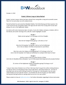 Grade 1 winner Long on Value has been retired from racing after a long and successful career. Plans for his stud career are still undetermined. Read the full release below.
