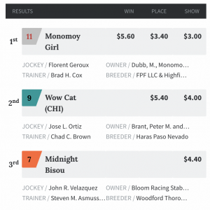 Monomoy Girl won for the tenth time in 12 career starts. She completed the mile-and-an-eighth distance in 1:49.79 as the 9-5 favorite. Rival Midnight Bisou came in third.