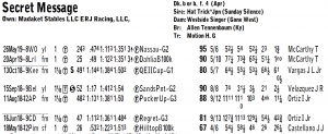 Bred in Kentucky by Allen Tennenbaum, Secret Message is the second foal and first graded stakes winner out of the Gone West mare Westside Singer.