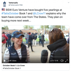 NEWMARKET, UK–On the one hand, their advent in Newmarket this week represented an entirely new venture in the diversifying portfolio of Bradley Weisbord and Liz Crow. On the other, both partners see a seamless efficiency between the things that have worked for BSW Bloodstock in the U.S., through Crow’s domestic selection of young stock, and the novel challenge of the Tattersalls October Sale.