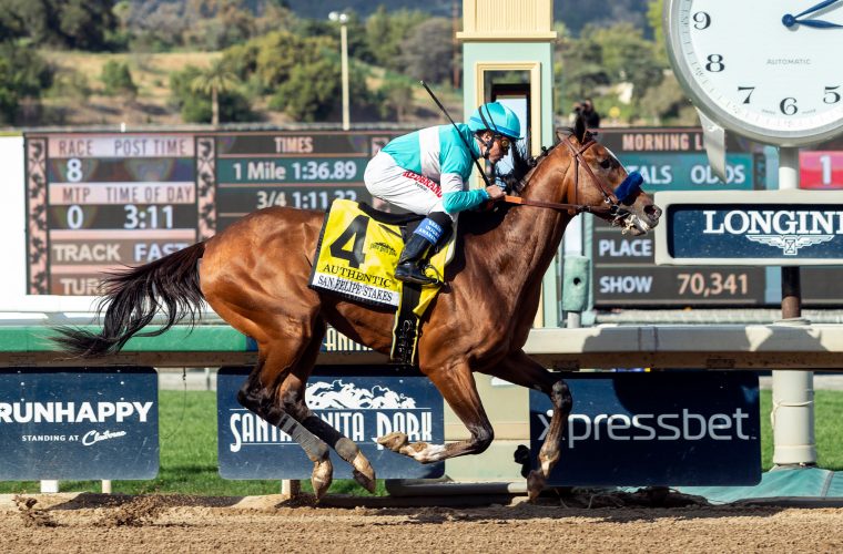 Authentic, stretched his undefeated record to three with another dominant victory in the G2 San Felipe last weekend at Santa Anita for owners SF Racing, Starlight Racing, Madaket Stables, Fred Hertrich, John Fielding and Golconda Stables. Prior to this race, Authentic was an easy debut winner before he ran away with the G3 Sham in early January by 7 3/4 lengths. For his efforts, Authentic earned 50 additional points towards the leaderboard for the Kentucky Derby. With his total now standing at 60, Authentic sits alone at the top of the standings.