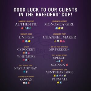 Champions and former Breeders’ Cup winners Monomoy Girl and Uni headlined 13 Breeders’ Cup pre-entries for BSW/Crow clients.