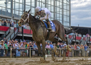 A severe storm rolled through the Baltimore area on Friday evening, delaying the running of the featured Black Eyed Susan. Less than 45 minutes after the worst of it had passed, the sun did in fact re-emerge, as Pimlico’s track crew worked diligently on the rain-drenched surface. The main event did in fact go on, although the final race on the card, a turf maiden special weight for fillies and mares, was cancelled.