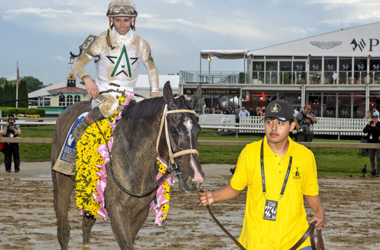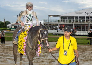 A severe storm rolled through the Baltimore area on Friday evening, delaying the running of the featured Black Eyed Susan. Less than 45 minutes after the worst of it had passed, the sun did in fact re-emerge, as Pimlico’s track crew worked diligently on the rain-drenched surface. The main event did in fact go on, although the final race on the card, a turf maiden special weight for fillies and mares, was cancelled.